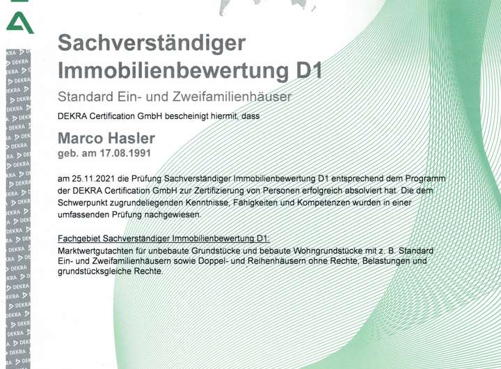 DEKRA zertifizierter Sachverständiger für Immobilienbewertung D1 für Standardobjekte mit DEKRA-Siegel