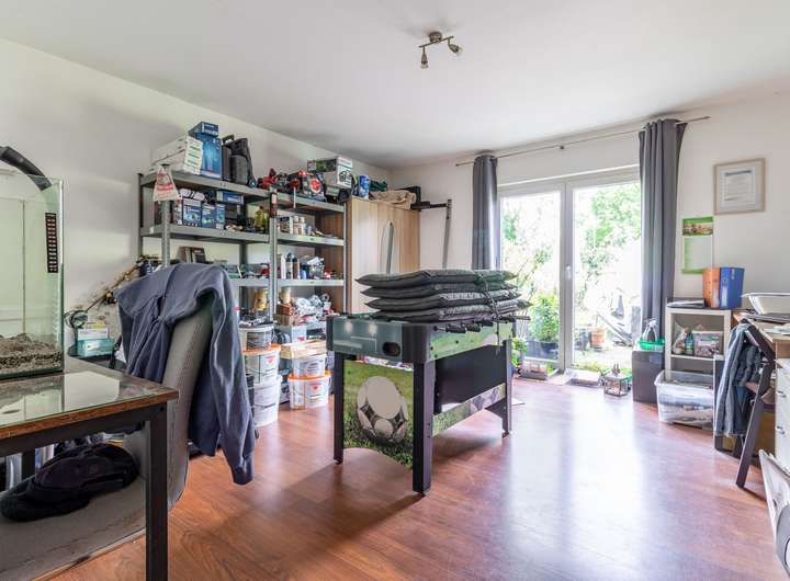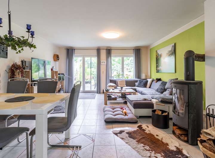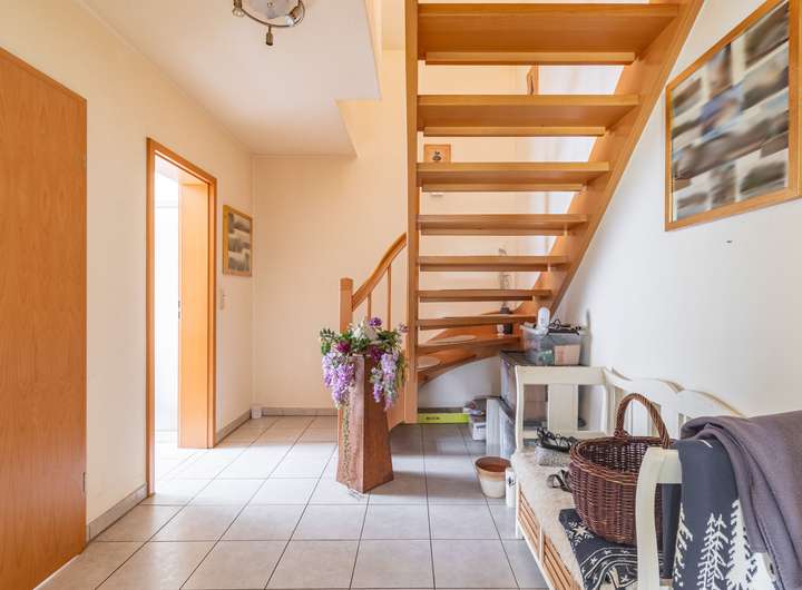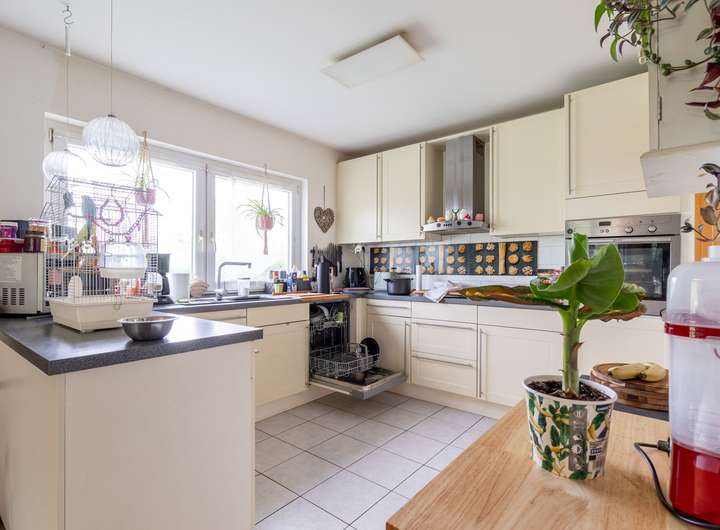 Nach betreten des lichtdurchfluteten Eingangsbereichs gelangen Sie rechtsseitig in den Heizungsraum, in das Wohnzimmer mit direktem Zugang zum Garten und in den Küchenbereich. Dieser verfügt über eine vollausgestattete Einbauküche, die im Preis inkludiert ist.