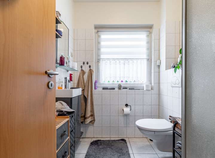Vor Kopf befindet sich ein Hauswirtschaftsraum bzw. ein Vorratsraum. Linksseitig haben Sie Zugang in das Obergeschoss für die Treppe und in das Badezimmer. Dieses verfügt über eine Dusche und ein Fenster.