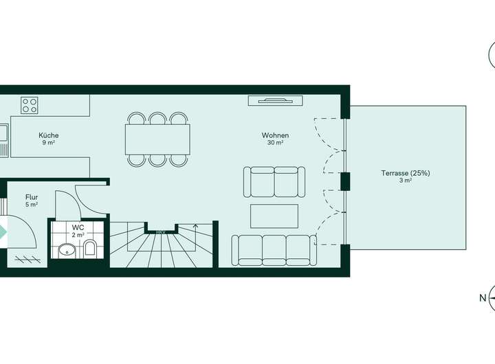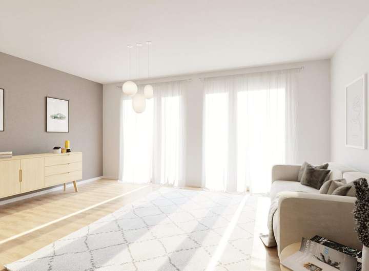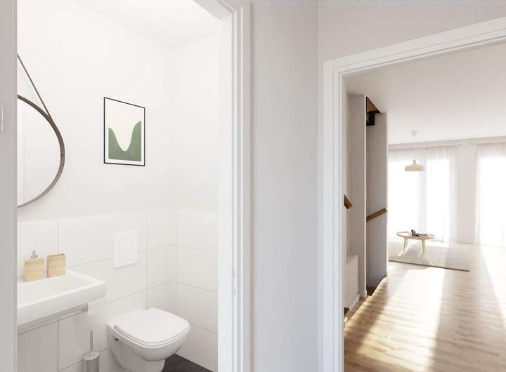 Willkommen in Ihrem neuen Reihenhaus. Betreten Sie den Eingangsbereich, der Sie mit einer Garderobe begrüßt und direkt zum Gäste-WC führt. Daran vorbei betreten Sie die offene Küche, die zum gemeinsamen Kochen einlädt und Platz für kulinarische Abenteuer bietet. Das Wohnzimmer ist ein Ort der Entspannung für Ihre Familie, mit direktem Zugang zur Terrasse, die zum Verweilen einlädt. Das Obergeschoss wird zu Ihrem entspannten Rückzugsort, mit einem Schlafzimmer samt Platz zum Arbeiten, einer separaten Ankleide und einem Badezimmer mit Wanne und Dusche.