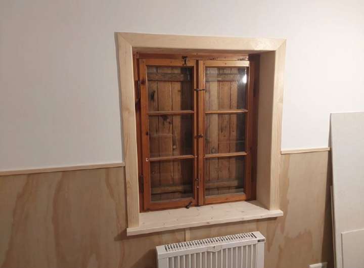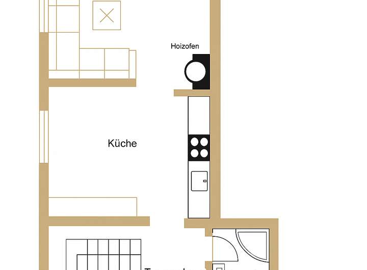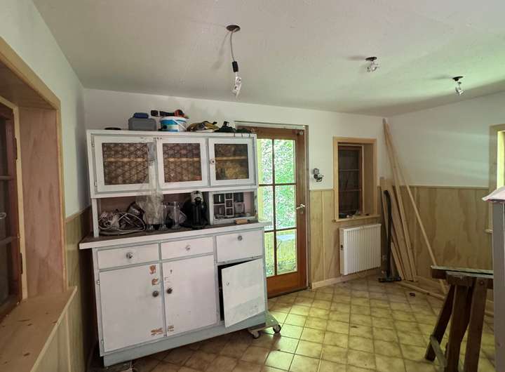 Der Wohnbereich umfasst eine offene Wohnküche mit Ofen sowie ein WC und eine Dusche. Das Haus wurde komplett entkernt, und derzeit werden Strom, Wasseranschlüsse sowie die Isolierung erneuert. Über eine Treppe gelangt man ins Dachgeschoss, das zusätzliche Fläche für einen Raum und eine Bühne bietet. Ein kleiner Keller bietet Platz für Stauraum und beherbergt die Haustechnik.