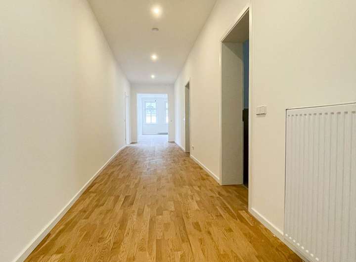 Über den großen Flur gelangen Sie in das moderne Badezimmer mit Wanne, das Gäste-WC mit Dusche und ein Kinderzimmer.