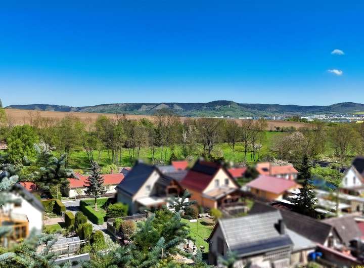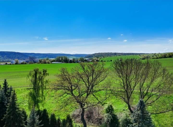 Eingebettet in eine sanft hügelige Landschaft, ist das Grundstück umgeben von weiten Feldern, Wiesen die je nach Jahreszeit ein wechselndes Panorama bieten – von leuchtendem Grün im Frühling bis hin zu goldenen Tönen im Spätsommer. Besonders reizvoll ist der freie Blick in Richtung Norden, wo sich bei klarer Sicht die Höhenzüge rund um Jena und Teile der Stadt selbst erkennen lassen. Die weite Sicht und das offene Umfeld vermitteln ein Gefühl von Freiheit und Entspannung, wie man es in Stadtnähe nur selten findet.