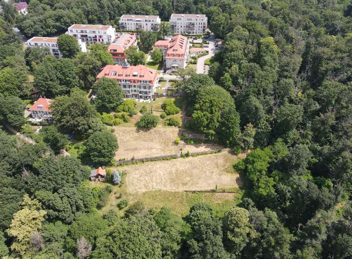 Auf dem als Gesamtensemble unter Denkmalschutz stehenden Areal des Königsparks in 01326 DD-Loschwitz befindet sich das hier präsentierte Baugrundstück. Das gemäß Parzellierungsvariante I (s. Fotos) geschnittene Grundstück (ca. 1750 m²) ist als Bauland ausgewiesen. Auf diesem Teil ist vom Eigentümer in Zusammenarbeit mit einem renommierten, lokalen Architekturbüro eine Baugenehmigung für ein Einfamilienhaus erwirkt worden. Die Baugenehmigung umfasst den Abriss des Altbestands (ehemals Terrassenhäuser des Luftkurbades) und den Neubau einer Einfamilien-Villa in moderner, ökologisch nachhaltiger Architektur. (Zwei Stellplätze werden mit verkauft?) Diese befinden sich auf dem Flurstück oberhalb des hier angebotenen Baugrundstücks.