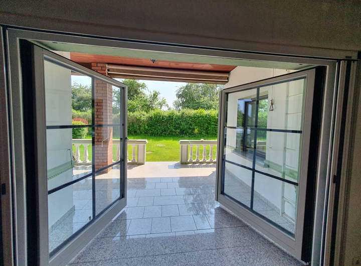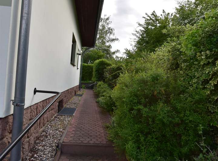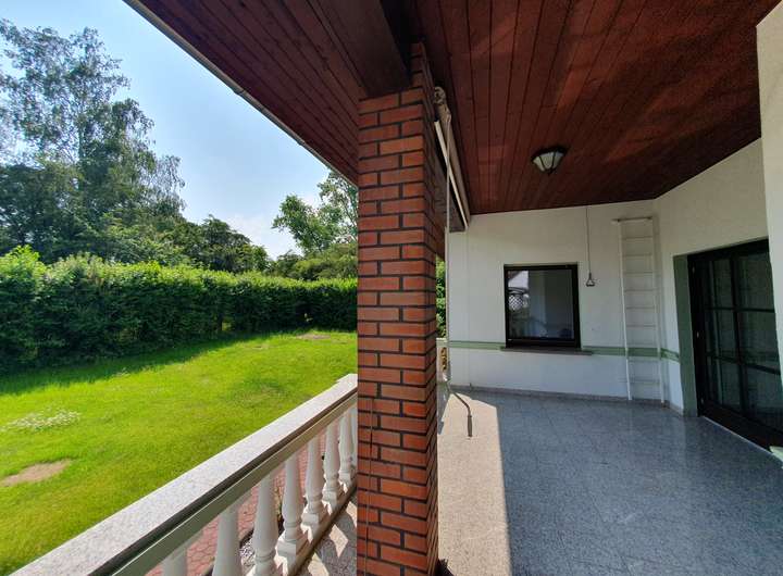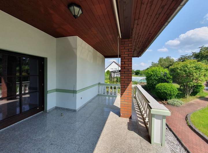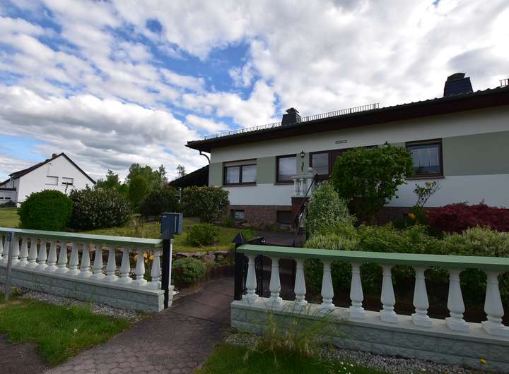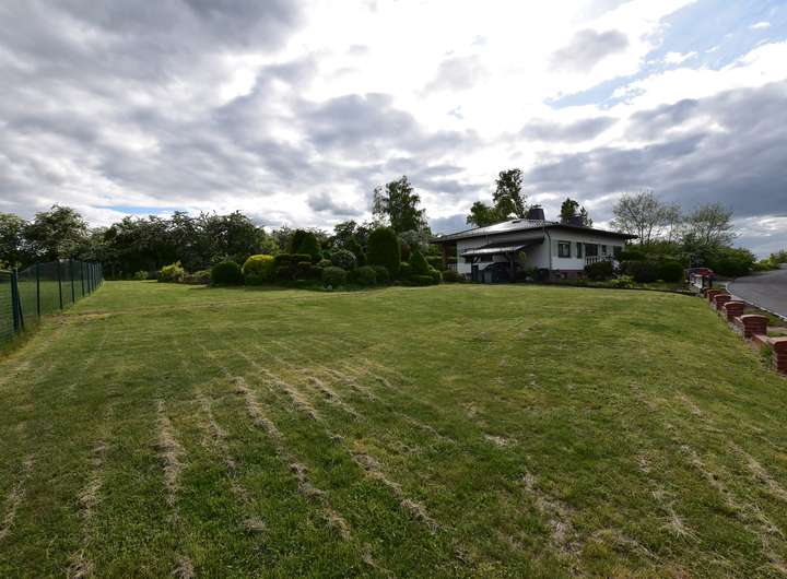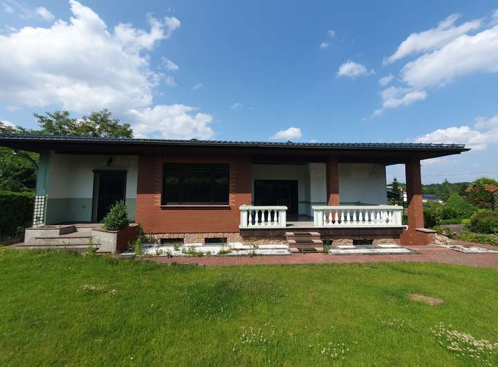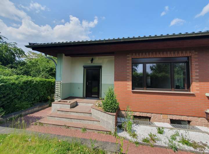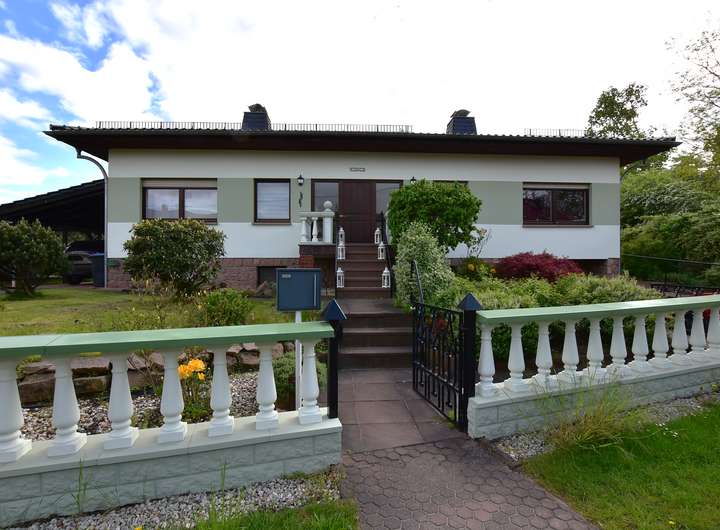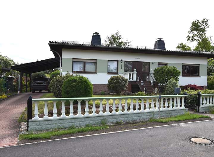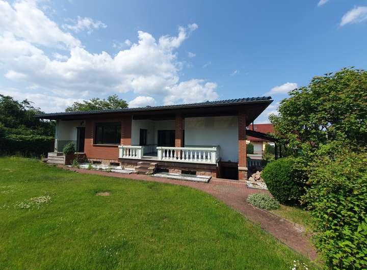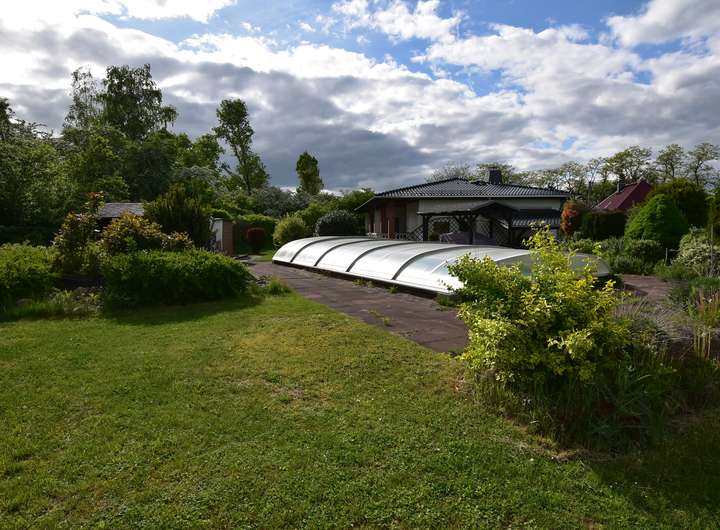 Zum Verkauf steht ein Einfamilienhaus im Bungalowstil mit Tiefgarage und überdachtem Außenpool.