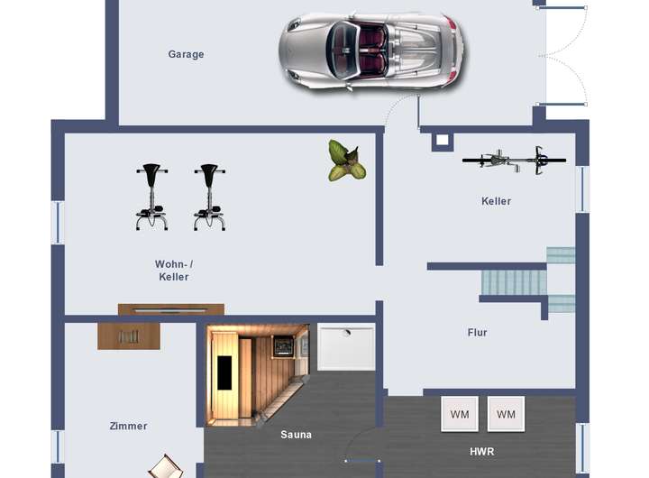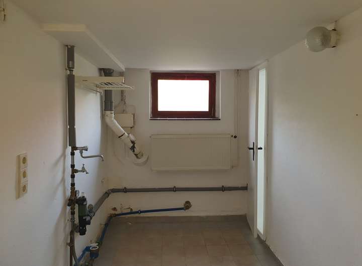 Über die offene Treppe gelangt man in den teilweise bewohnbaren Kellerbereich. Dort befindet sich die elektrische Dampfsauna mit einer zusätzlichen Dusche und einem Ruheraum. Außerdem gibt es einen großen Kellerraum, der als zusätzliches Wohn- oder Arbeitszimmer genutzt werden kann. Im Heizungsraum steht die Öl-Heizung der Firma Strebel aus dem Jahr 1992 mit einer ca. 7 Jahre alten Buderus Brauchwasser-Wärmepumpe. Im Kellergeschoss befindet sich des weiteren die Garage mit Platz für eine kleine Werkstatt.