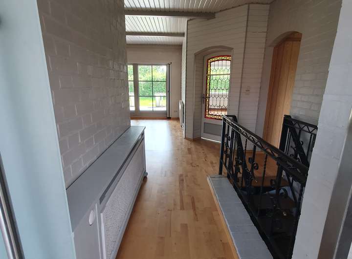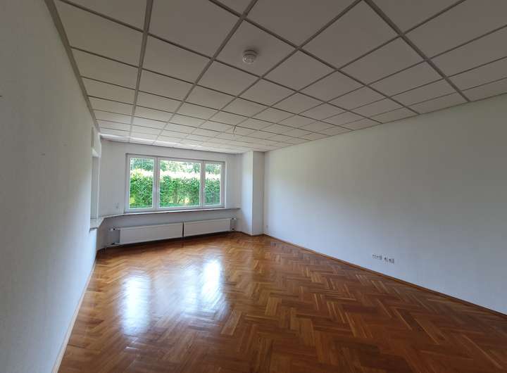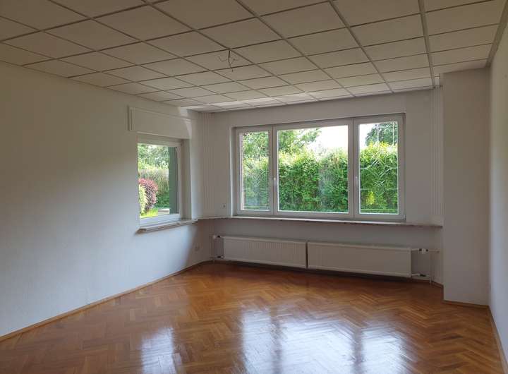 Im Erdgeschoss befinden sich 3 Schlafräume, ein Wohnzimmer, ein offener Essbereich mit großer Terrassentür und Blick über die Terrasse in den Garten, eine Küche, ein Bad mit Dusche und elektrischer Fußbodenheizung sowie ein Arbeitszimmer mit separatem Zugang von Außen. Das Arbeitszimmer besitzt ein zusätzliches WC und eine kleine Küchennische. Wohnzimmer, Essbereich und ein Kinderzimmer sind mit Parkettboden belegt, das Schlafzimmer und ein Kinderzimmer mit Laminat.