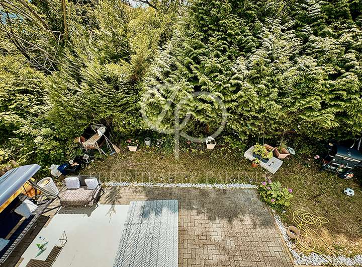 Das 258m² großen und pflegeleichte Grundstück bietet 2 Terrassen. Die mit ca. 30m² größere Terrasse im Garten, hat optimaler Weise eine Süd-Ausrichtung. Die westliche Terrasse kann aber gleichzietig als Stellplatz genutzt werden. Beide erreichen Sie über bodentiefe Terrassentüren.