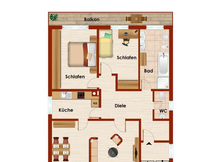 Die Wohnung im 1.OG verfügt 87,9 m² Wohnfläche und hat eine ähnliche Aufteilung wie die Wohnung im Erdgeschoss. 2 Balkone – einer zum Garten und einer zur Straßenseite, bieten Platz für gemütliche Stunden an der frischen Luft. Dieser Wohnung wurde in der Teilungserklärung das alleinige Nutzungsrecht an Fläche im Spitzboden zugeteilt. Der Zugang zum Spitzboden erfolgt über eine ausklappbare Holzleiter im Treppenhaus.