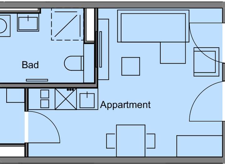 Das Appartement besteht aus einem offen gestalteten Wohn-/Schlafbereich mit Zugang zum großzügigen Balkon sowie einem modernen Badezimmer mit Dusche. Die Wohnung ist hell und freundlich gestaltet, die großen Fenster sorgen für eine angenehme Tageslichtatmosphäre.