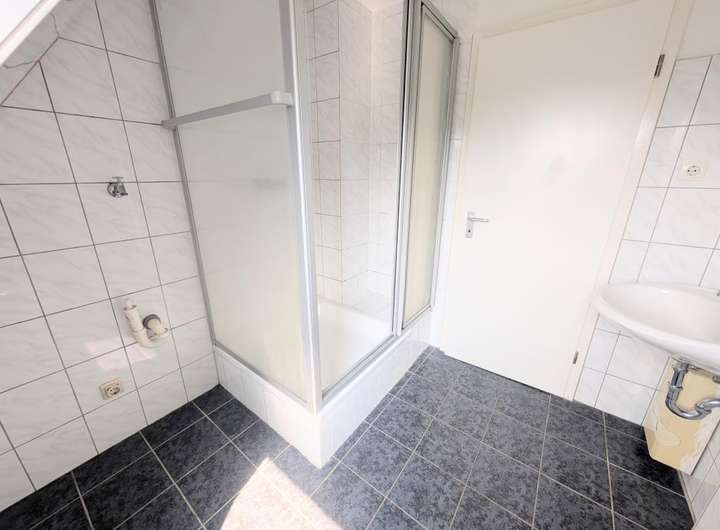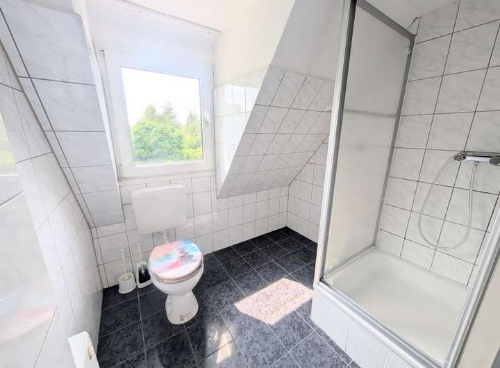 Das Badezimmer ist modern gefliest und verfügt über eine Dusche und einen Waschmaschinenanschluss. Ein Fenster sorgt für ausreichend Tageslicht.