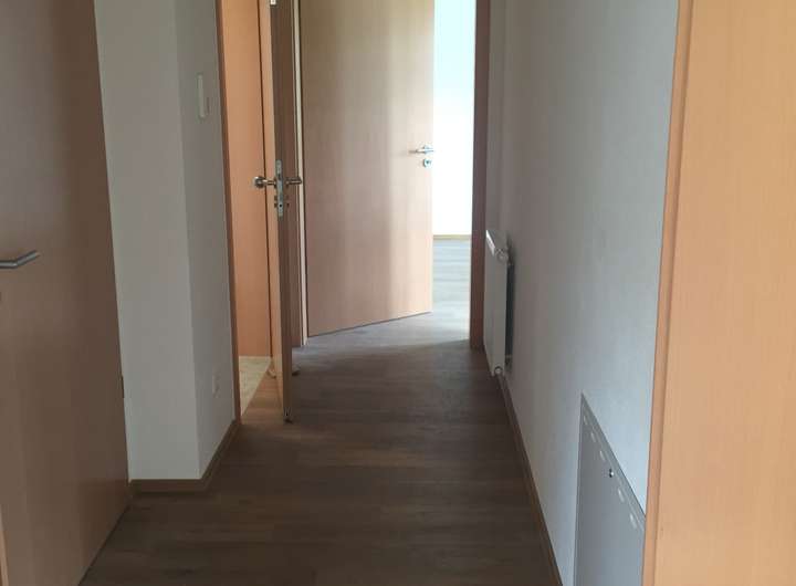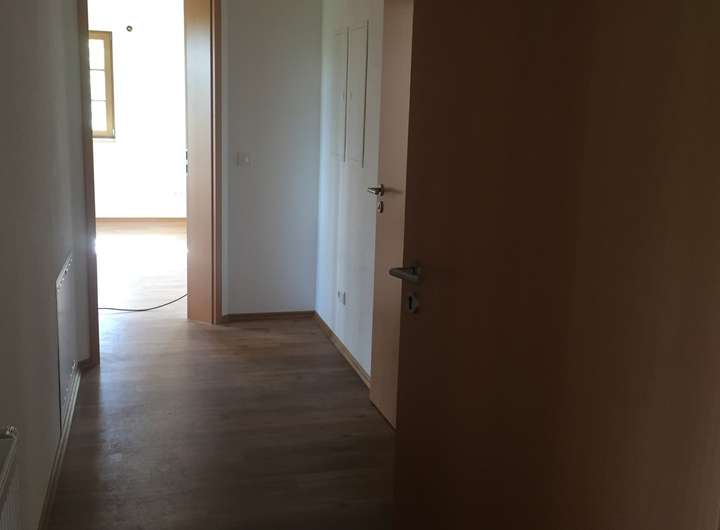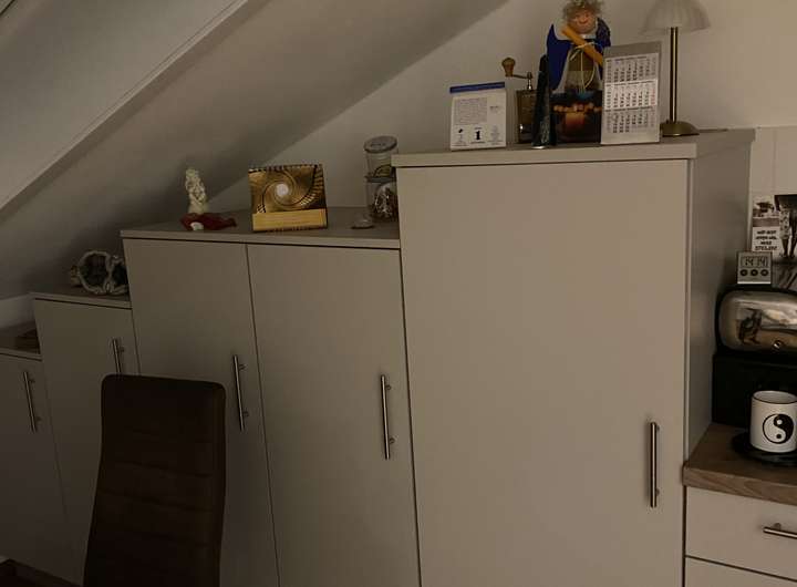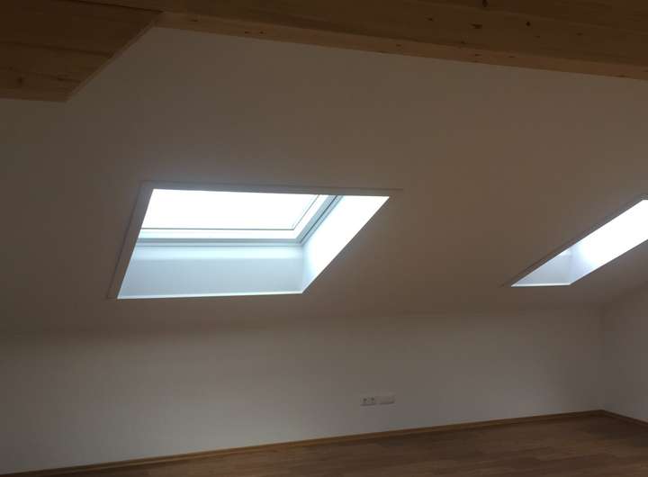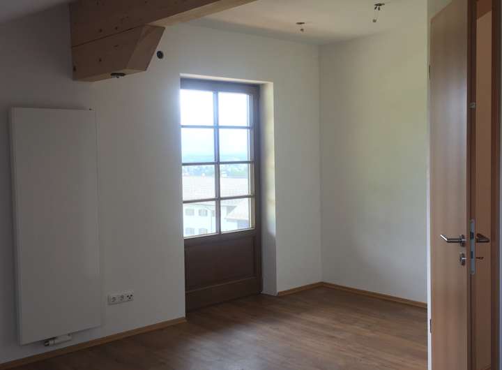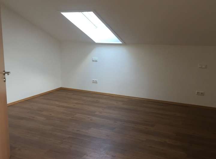 Die Wohnung präsentiert einen angenehm wohnlichen Grundriss. Der Flur ist im Winter nicht sonderlich hell, jedoch die übrigen Zimmer. Das Wohnzimmer liegt zum Süden mit zwei hellen Dachflächenfenster, ein großes und ein kleiners und elektrischen Außenjalousien, sowie Ausgang zum Balkon und offenem Kochbereich mit kompletter moderner Einbauküche mit Kühlen, Geschirrspüler, Spüle und dirversen Schrankelelmenten. Das Schlafzimmer hat im Schlafbereich ein klenes Dachfenster mit eleltrischer Jolousie, sowie eine Büroarbeitsnische mit Ausgang zum Ostbalkon und sehr schönem Blick auf die nahe Umgebung mit Berg- und sogar etwas Seeblick. Diele, sowie alle Wohnräume sind einheitlich mit pflegeleichten und wohligwarmen Holzoptik-Vinylböden (Unterseite bestehend aus Holzpanele) ausgelegt. Das innenliegende Badezimmer zeigt sich in moderner Note mit geräumiger und schwellenfreier Duschkabine, WC, Handtuchtrockner, Waschbecken und Anschluss für die Waschmschine. Die Wohnung wird mit großen Heizkörper der Zentralheizung erwärmt. Es gibt auch im Kellergeschoss des Hauses ein separat zugewiesenes und geräumiges Kellerabteil mit Licht und Steckdose. Im Innenhof des Anwesens ist ein Pkw-Stpellplatz zugewiesen. Fahrradständer gibt es nur im Freien (auch für die E-Bikes).