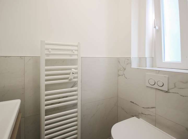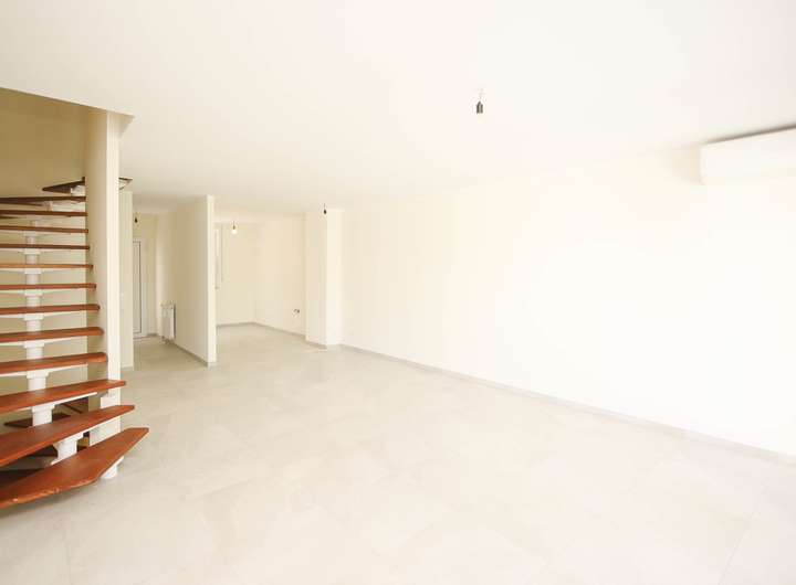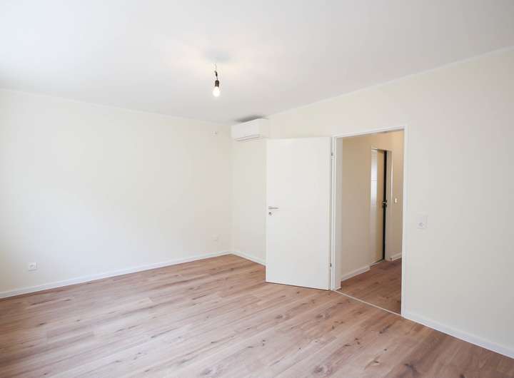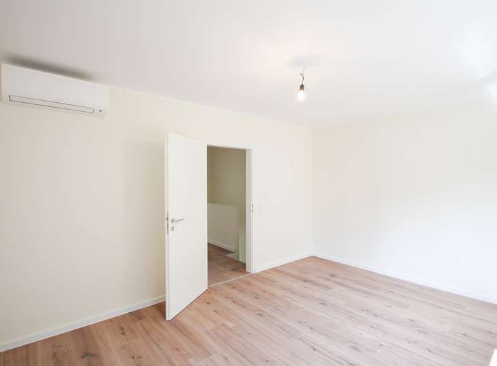 Im Erdgeschoss finden Sie ein geräumiges Wohnzimmer, das ebenfalls mit einer Klimaanlage ausgestattet ist. Große Fenster, die erst vor 2-3 Jahren modernisiert wurden, sorgen hier für reichlich Tageslicht und bieten einen angenehmen Ausblick auf die Umgebung. Der Bodenbelag wurde im Zuge der Renovierungsarbeiten erneuert und verleiht dem Haus einen hellen und einladenden Charakter. Auch die Wände sind frisch gestrichen und tragen zu einem modernen Erscheinungsbild bei.