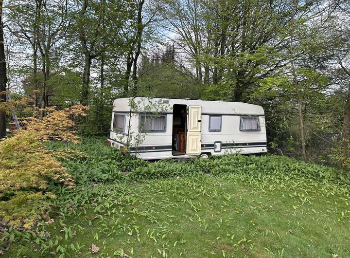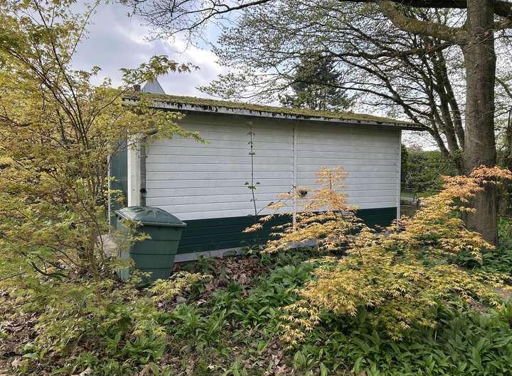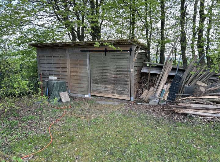 Auf dem Grundstück stehen ein Wohnwagen, der als gemütlicher Rückzugsort oder Gästeunterkunft genutzt werden kann, sowie eine Garage und ein Geräteschuppen, die ausreichend Stauraum für Werkzeuge, Gartengeräte und weitere Utensilien bieten.