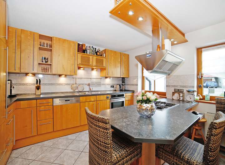 Besonders erwähnenswert ist der moderne, holzbefeuerte Kachelofen mit intelligenter Automatiksteuerung. Neben seinem stilvollen Erscheinungsbild überzeugt er durch eine effiziente und gleichmäßige Beheizung beider Wohnetagen – Erdgeschoss und Obergeschoss – mit angenehmer, langanhaltender Strahlungswärme.