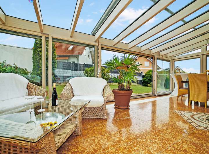 - 40 m² großer Wintergarten mit Holzrahmen, außen mit Aluminium verkleidet