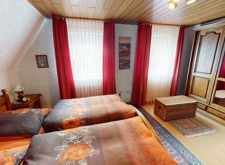 Das Haupthaus verfügt über vier Zimmer, eine Küche, ein Badezimmer mit Wanne und Fenster sowie ein Gäste-WC, das 2017 modernisiert wurde. Die Raumaufteilung ermöglicht Flexibilität, da verschiedene Wände durchbrochen werden können, um beispielsweise die Küche mit dem Esszimmer zu einem offenen Bereich zu verbinden oder das Badezimmer zu erweitern. Im oberen Stockwerk befindet sich außerdem ein geräumiger Speicher, der zusätzlichen Stauraum bietet und eine Vielzahl von Nutzungsmöglichkeiten erlaubt. Ein französischer Balkon verleiht diesem Stockwerk zusätzlichen Charme.