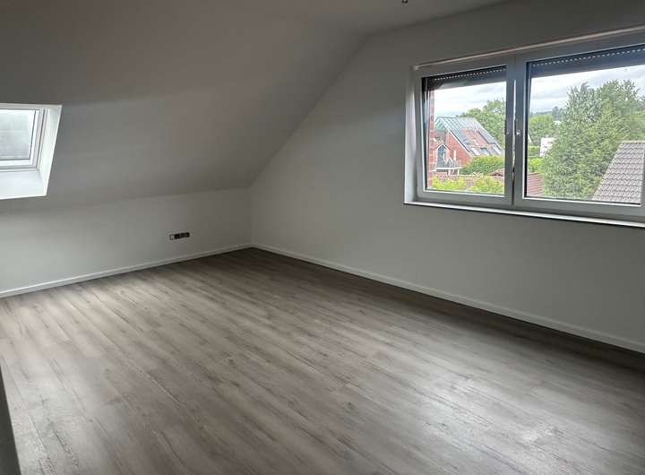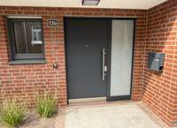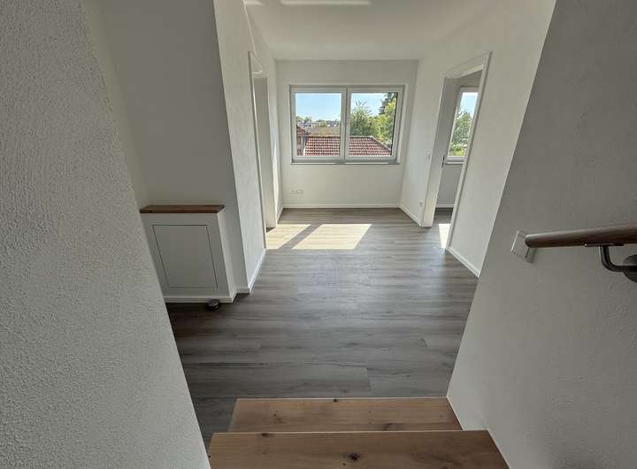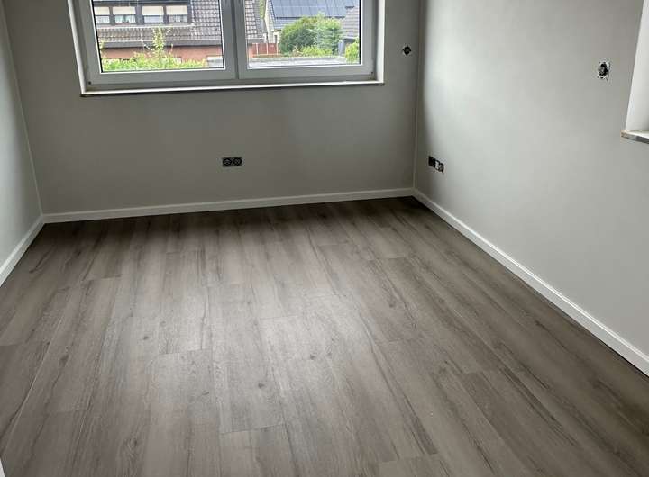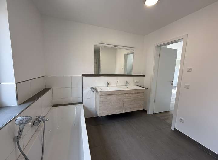 Kunststofffenster zweifarbig innen weiß, außen grau mit dreifach Verglasung und elektrischen Außenrollos, weiße Innentüren mit Edelstahltürdrückern, Bodenbeläge teilweise Fliesen und Vinyl in Holzoptik, modernes helles Bad mit ebenerdiger Dusche, einem niedrigem Einstieg in die Badewanne, zwei Waschtische und Fenster, modernes Gäste - WC, Fußbodenheizung über eine Luftwärmepumpe,