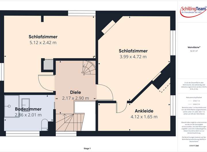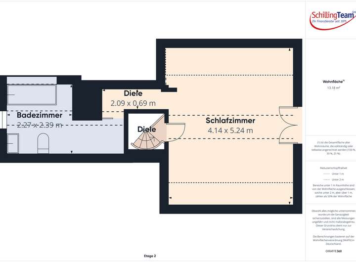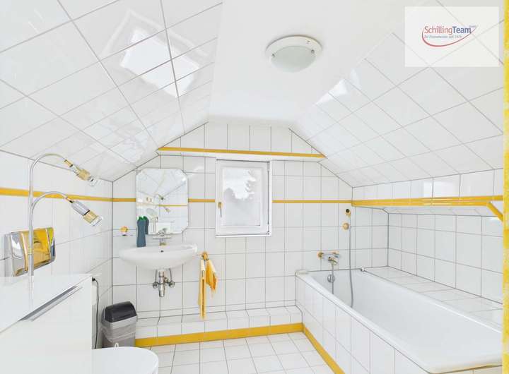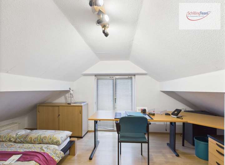 Über eine Wendeltreppe gelangt man in das ausgebaute Dachgeschoss. Eine ideale Lösung für ein Büro oder ein weiteres Schlafzimmer. Ältere Kinder hätten dort ihren eigenen Bereich, da sich auch im Dachgeschoss ein Badezimmer mit Badewanne befindet.