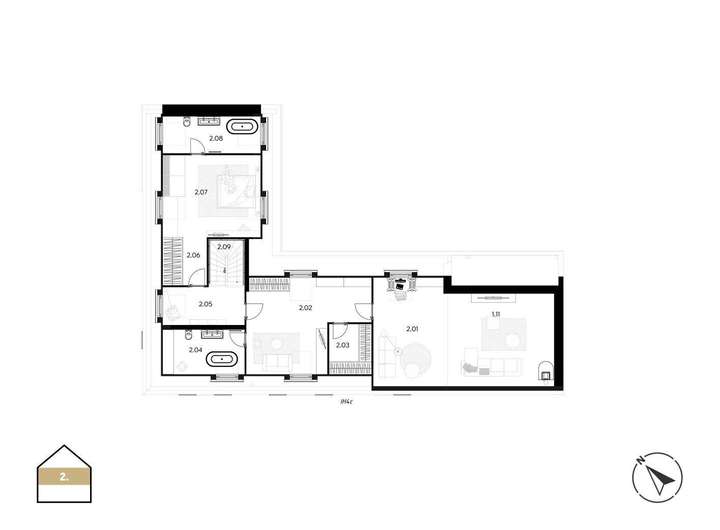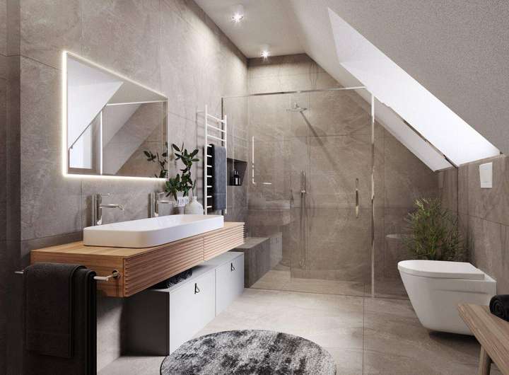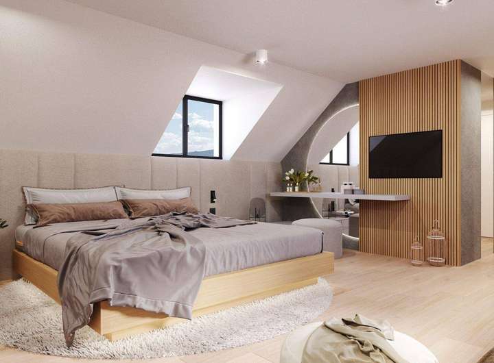 Das geplante Erdgeschoss empfängt Sie mit einer Eingangshalle, von der aus ein Badezimmer, zwei Schlafzimmer und ein privater Wellnessbereich mit vollständiger Ausstattung zugänglich sind. Der Flur führt weiter in einen großzügigen Wohnbereich, der mit der Küche verbunden ist und auf eine wunderschöne Terrasse mit einzigartigem Blick auf die Wasseroberfläche führt. Der gesamte Innenbereich geht nahtlos in eine gemütliche Terrasse über, die für einen Pool vorbereitet ist, sowie in einen großzügigen privaten Garten, der von Natur umgeben ist. Im Dachgeschoss befindet sich eine helle Galerie sowie zwei separate Suiten, jede mit eigenem Bad und begehbarem Kleiderschrank.