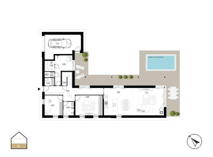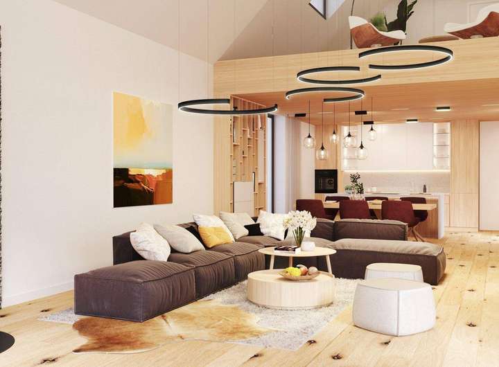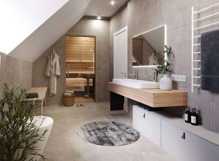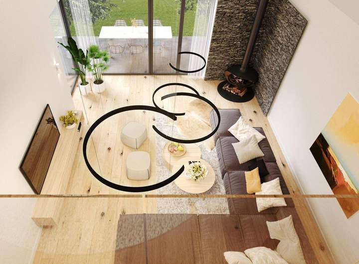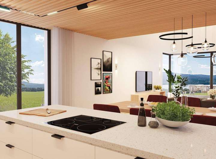 Der Hausentwurf berücksichtigt eine Reihe von Premium-Features, darunter eine Holzgiebel-Fassade, eine private Garage, große Glasöffnungen, ein Kaminofen sowie die Vorbereitung für eine Sauna und eine Solaranlage. Das Haus ist zudem für Smart-Home-Technologien vorgesehen, die in ein zentrales System integriert sind. Dieses ermöglicht die Fernsteuerung des Zugangs und der Sicherheit sowie die Optimierung der elektrischen Heizung und Beleuchtung.
