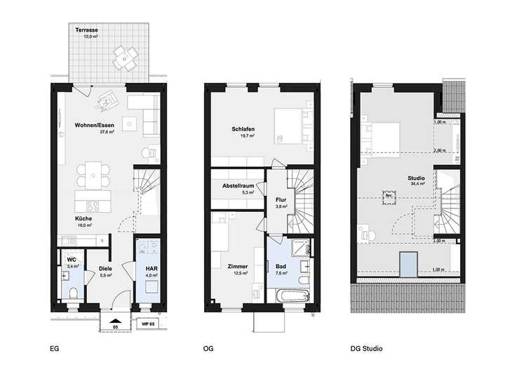 entsprechen dem Programm Klimafreundlicher Neubau (297+298) der KfW und sind somit förderfähig. Die 4-Zimmer-Häuser erhalten eine