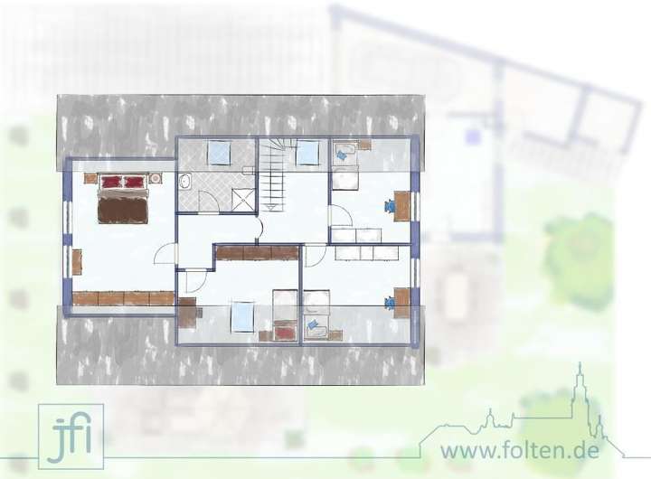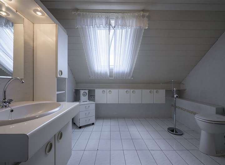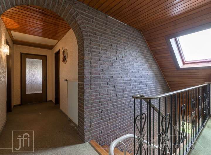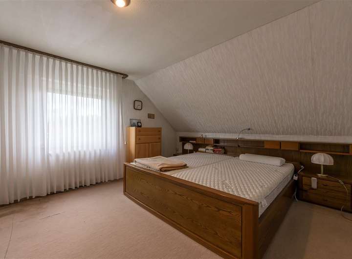 Dachgeschoss: ein sehr großes Schlafzimmer, drei weitere Zimmer, Duschbad, Flur, darüber Dachboden als Stauraum.