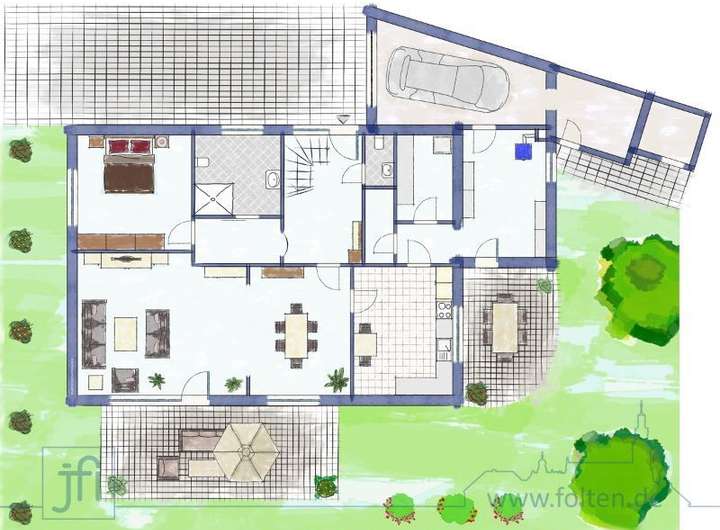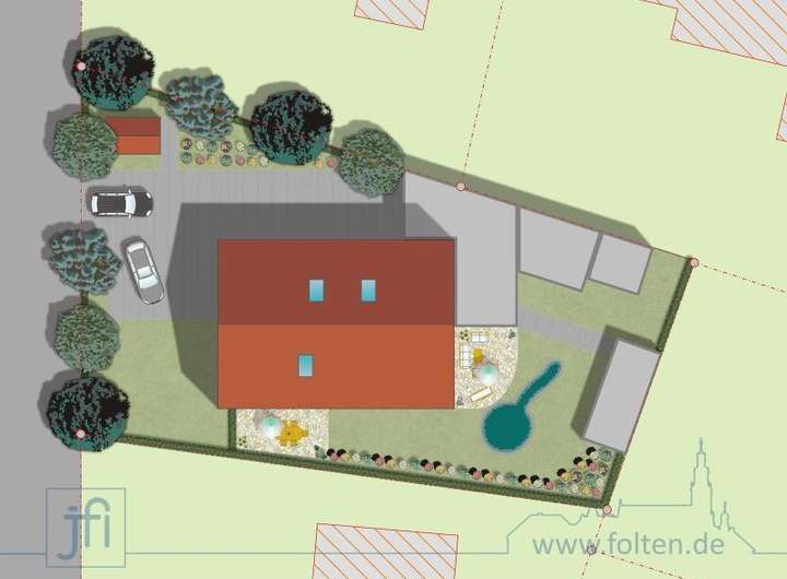 Der Garten mit Rasenflächen, einem kleinen Teich, Beeten, Sträuchern und Bäumen ist komplett eingefriedet. Die große Auffahrt bietet Ihnen genügend Abstellmöglichkeiten für Ihre Fahrzeuge. Mehrere Nebengebäude sorgen zudem für reichlich Stauraum für Fahrräder, Gartengeräte usw.