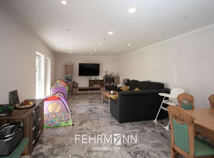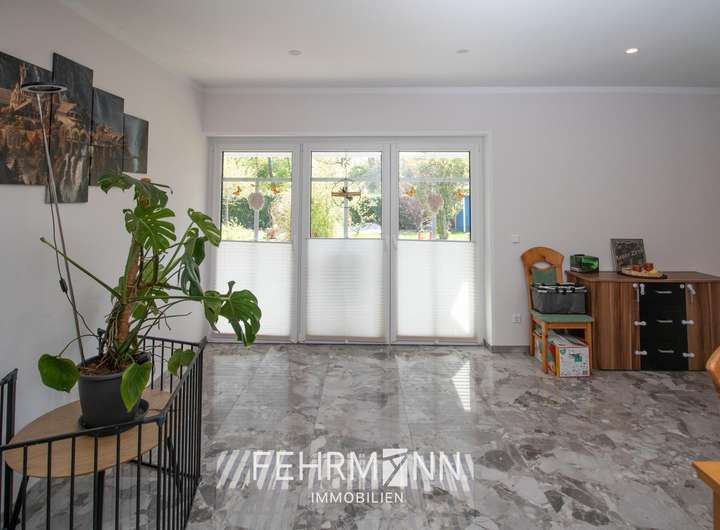 Der Wohnbereich ist ideal für geselliges Beisammensein konzipiert. Das lichtdurchflutete Wohnzimmer ist großzügig angelegt und durch seine harmonische Gestaltung die perfekte Umgebung für entspannte Abende mit Familie und Freunden.