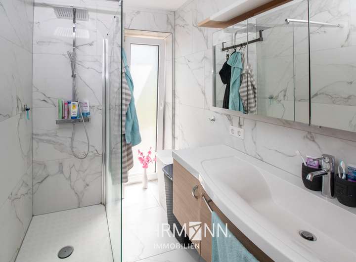 Das gut ausgestattete, ebenerdige Badezimmer sorgt für Komfort und Bequemlichkeit im Alltag.