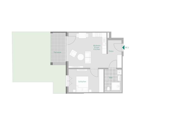 Kompakte & durchdachte 2-Zimmer-Erdgeschoss-Wohnung mit großzügiger Terrasse. Private Diele mit Garderoben-Stellfläche, altersgerechtes Duschbad mit Waschmaschinen-Anschluss sowie großzügiges Schlafzimmer mit ausreichend Schrankfläche.