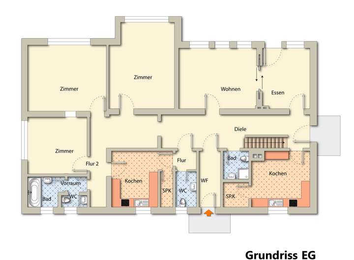 Der Hauseingang auf der rechten Seite führt Sie über einen geschützten Windfang direkt in die weitläufige Diele. Sie bildet das Herzstück des Hauses, von hier aus sind sämtliche Räume des Erdgeschosses zu erreichen. Das angrenzende Wohnzimmer ist sehr schön hell und bietet reichlich Platz für frische Einrichtungsideen. Fließend geht es in das Esszimmer über als idealen Raum für gemeinsame Mahlzeiten. Von hier aus gelangen Sie direkt auf die Terrasse, die perfekt geeignet ist für entspannte Stunden im Freien.