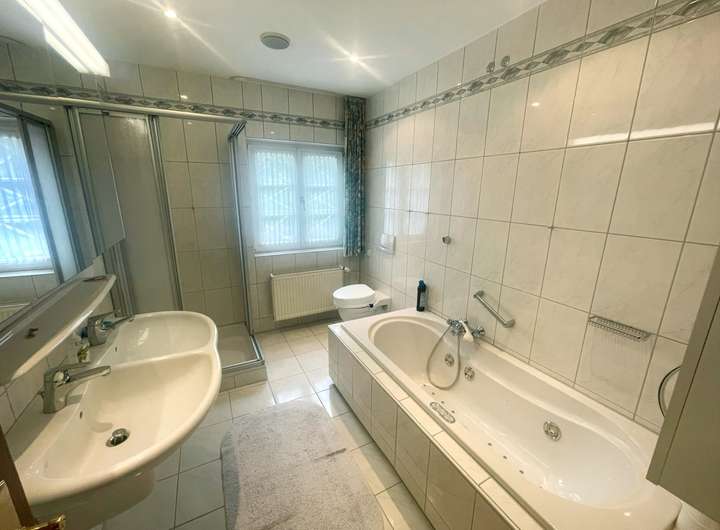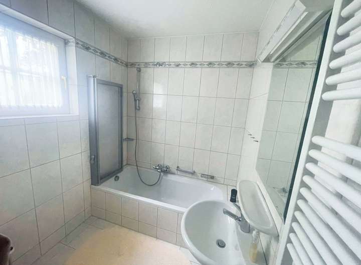 Auf derselben Etage befinden sich ein Badezimmer mit Badewanne, Waschbecken und einem Handtuchheizkörper sowie ein separates Gäste-WC.