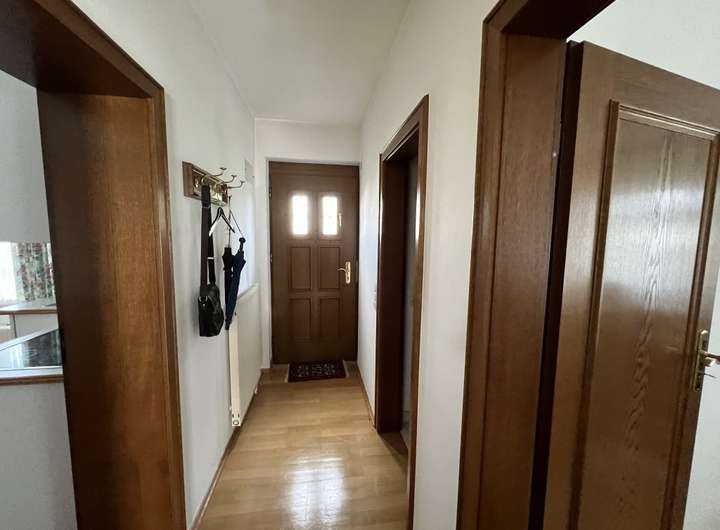 Auf der linken Seite des Hauses führt ein separater Zugang in eine potenzielle zweite Wohneinheit. Sie gelangen in einen Flur, von dem aus es weiter in die anderen Räume geht. Ein Wohnzimmer, eine Küche mit eigener Speisekammer, ein Schlafzimmer sowie ein weiteres Zimmer, das ideal als Kinder- oder Arbeitszimmer, genutzt werden kann, schließen sich an. Das Badezimmer ist sowohl mit einem Waschbecken als auch einer Badewanne ausgestattet, das WC befindet sich in einem separaten Raum.