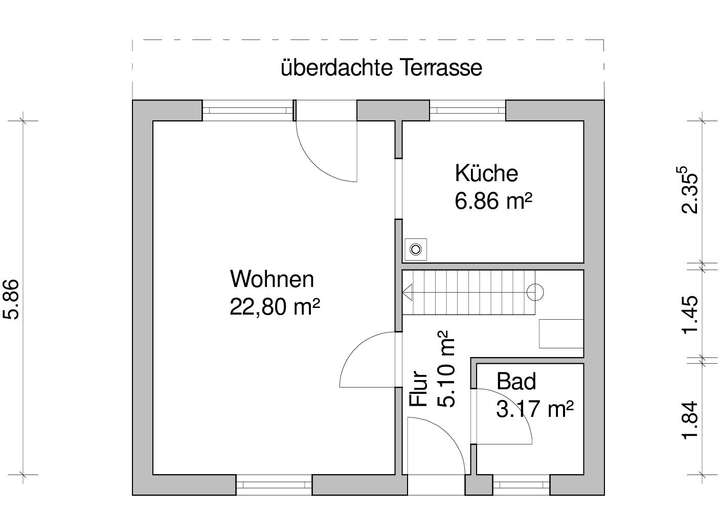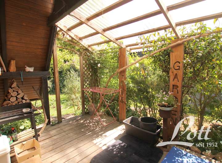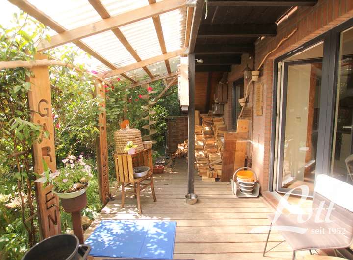 Die vom Wohnzimmer zugängliche, teilüberdachte Holzdeckterrasse ist ideal zur Abendsonne ausgerichtet und lädt zum Entspannen und Verweilen ein.