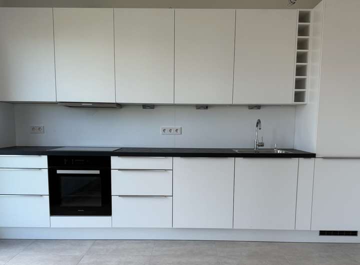 Exklusive Einbauküche mit modernen und hochwertigen Miele Geräten Echtholzparkett (Eiche) in Wohn- und Schlafzimmer der Marke Bauwerk