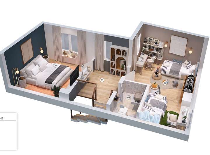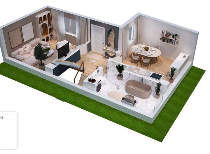- EG: Küche, Wohnzimmer, Tageslichtbad mit Dusche