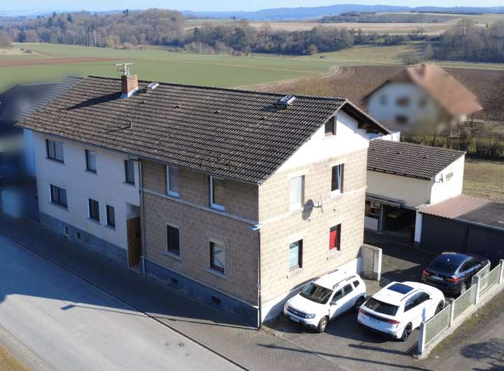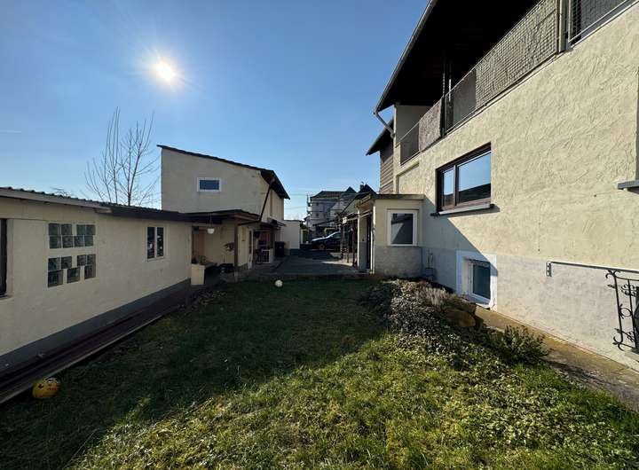 verschiedene Nebengebäude und eine Garage, sowie einen Gartenbereich. Seitlich des Hauses