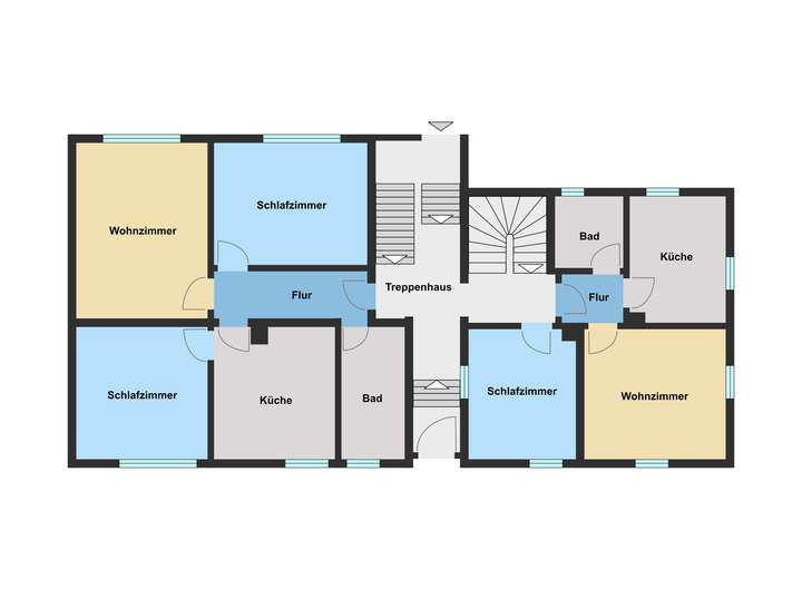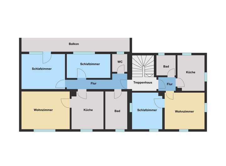 mit ca. 78qm und einem großen Balkon. Auf der rechten Seite sind zwei Zweizimmerwohnungen,