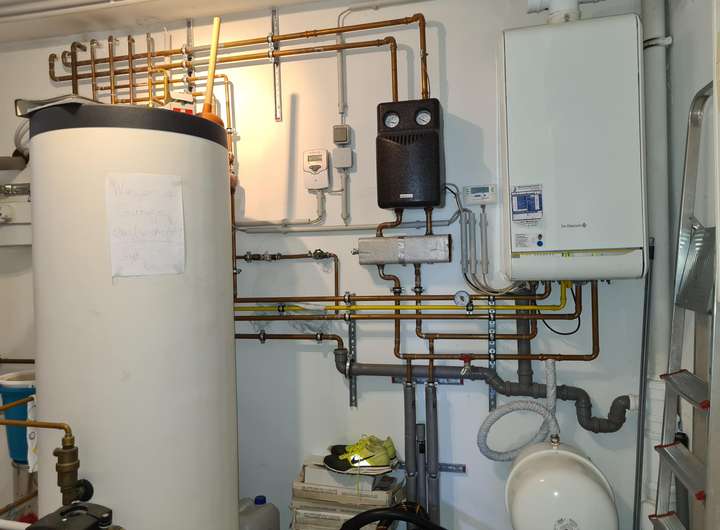 Der Heizkessel ist ein Gasbrennwertgerät, zur Warmwasserbereitung ist zusätzlich eine Solaranlage eingebaut.