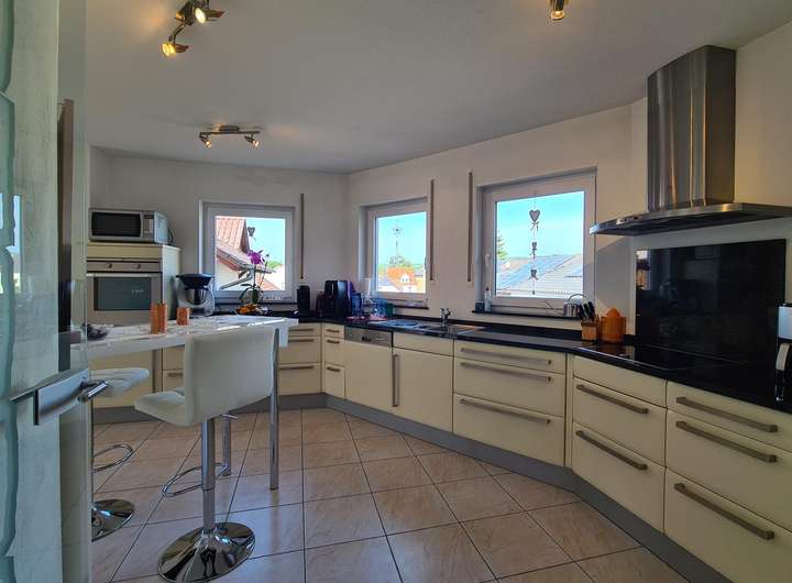 großzügiger Eingangsbereich, Gäste-WC, große offene Küche ca. 14 m² mit moderner Einbauküche, Wohn- und Essbereich ca. 41 m² mit Ausgang auf ca. 40 m² große SW-Terrasse