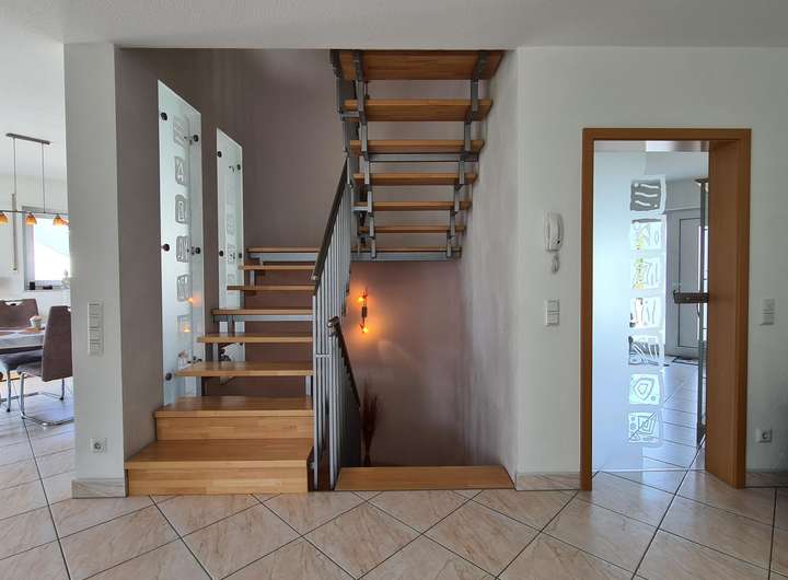 - Innentreppe: Stahlkonstruktion mit Buche-Stufen