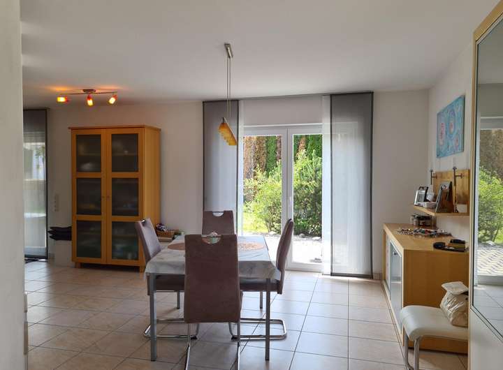 Der Garten ist als Grünanlage mit Rasenfläche, Ziersträuchern und Thujas als Randbepflanzung angelegt; hinter dem Haus schließt sich eine ca. 40 m² große Südterrasse an, die vom großzügigen Wohn- und Eßbereich durch 2 große bodentiefe Fenstertürelemente ebenerdig erreichbar ist.