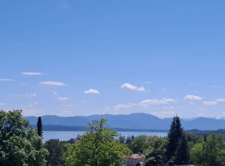 Die leichte Hanglage ermöglicht einen Blick auf die Bergkette und den Starnberger See von allen Fenstern aus.
