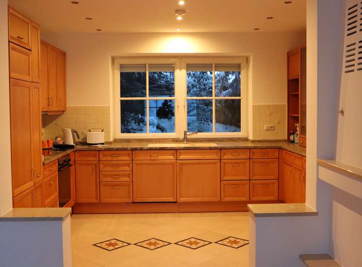 Die gesamten Böden im oberen Stockwerk sind mit hochwertigem Parkett, Eiche weiss Schiffsboden geölt, neu verlegt worden. Im Wohnzimmer und Klavierzimmer wurde Eiche hell, Fischgrätverlegung verlegt. Die hochwertige Einbauküche aus Kirschholz ist mit modernen Elektrogeräten ausgestattet. 2 Kamine schaffen eine gemütliche Atmosphäre. Ein zusätzlicher Grillplatz befindet sich im Garten für gemütliche Abende.