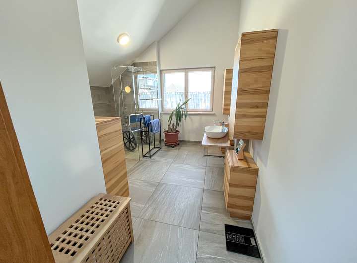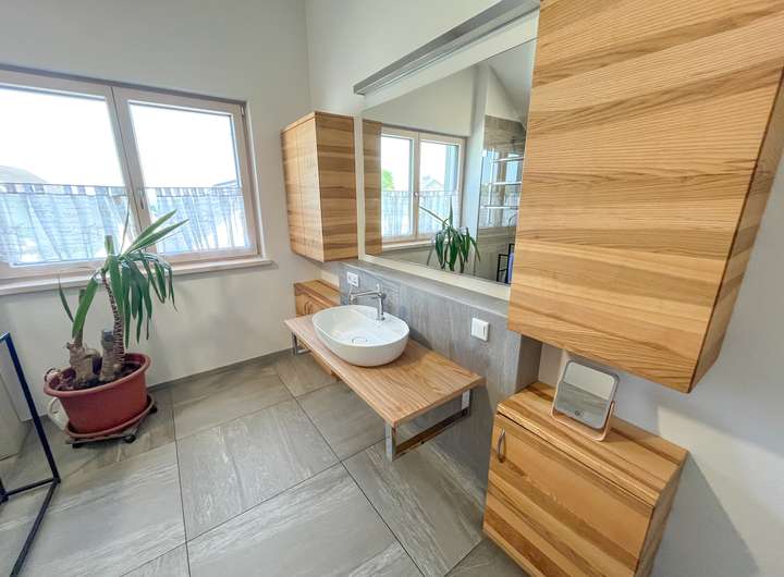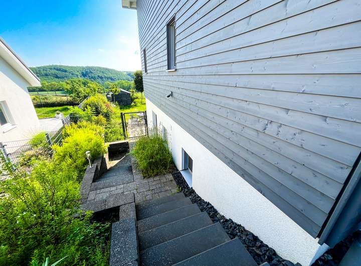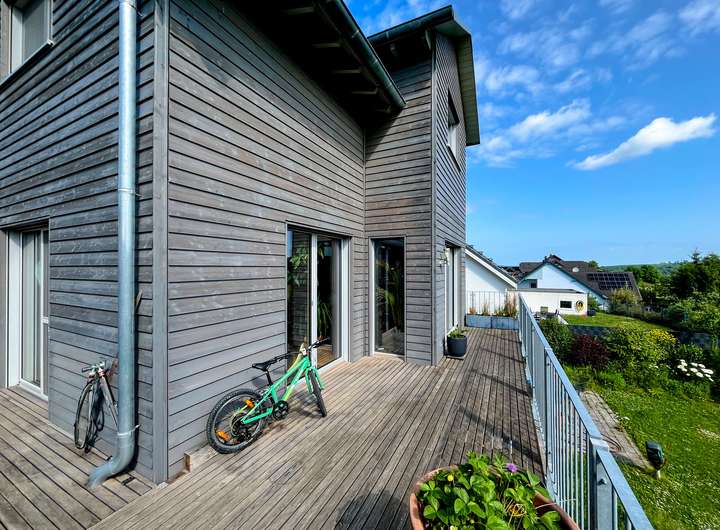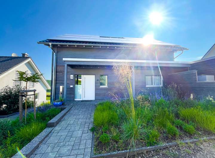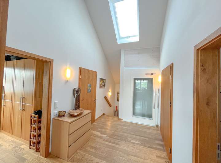 Willkommen in einem Zuhause, das modernen Wohnkomfort, Barrierefreiheit und nachhaltiges Bauen in perfekter Harmonie vereint. Dieses neuwertige Einfamilienhaus mit Einliegerwohnung aus dem Jahr 2019 wurde in hochwertiger Holzbauweise als Baufritz-Haus errichtet und erfüllt höchste Ansprüche an Ökologie, Energieeffizienz und Wohnqualität. Mit einer Wohnfläche von ca. 194 m², verteilt auf drei Ebenen, acht Zimmern, zwei Badezimmern und einem zusätzlichen Gäste-WC mit Dusche, bietet dieses Haus großzügigen Raum für Familien, Mehrgenerationenwohnen oder anspruchsvolles Arbeiten und Leben unter einem Dach. Ein Aufzug verbindet alle Etagen komfortabel miteinander – ein besonderes Plus an Barrierefreiheit und Komfort. Die Einliegerwohnung mit separatem Zugang, eigener Küche, Bad und Zugang zum Garten eignet sich ideal für Gäste, größere Kinder oder eine Pflegekraft. Auch als Homeoffice oder kleine Praxis ist sie perfekt nutzbar. Das liebevoll angelegte Grundstück (ca. 630 m²) bietet mit Terrasse, kleinem Teich, Gartenhaus und einer gepflegten Bepflanzung eine wahre Oase der Erholung. Carport, Stellplatz, Zisterne sowie eine hochwertige PV-Anlage mit Batteriespeicher ergänzen dieses durchdachte Angebot.