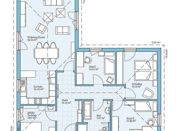 • Ebenerdiges Wohnen: Barrierefreiheit ist hier kein Problem. Alle wichtigen Bereiche sind bequem auf einer Ebene erreichbar, was den Bungalow auch ideal für Senioren oder Familien mit kleinen Kindern macht.