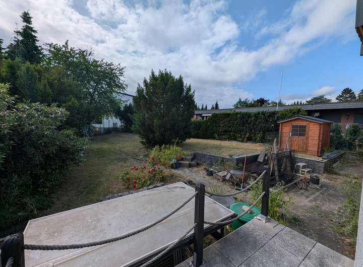 •Gemütlicher Garten mit einem Gartenhaus für Gartengeräte