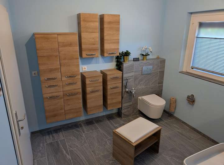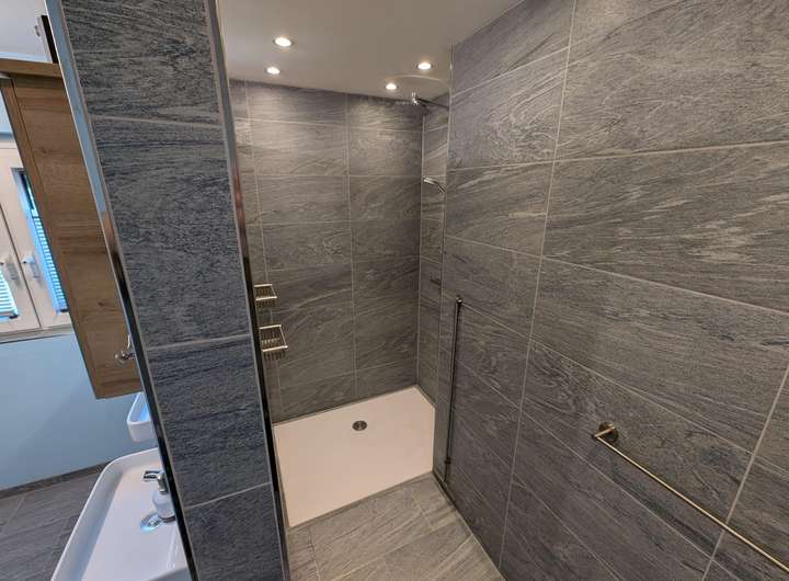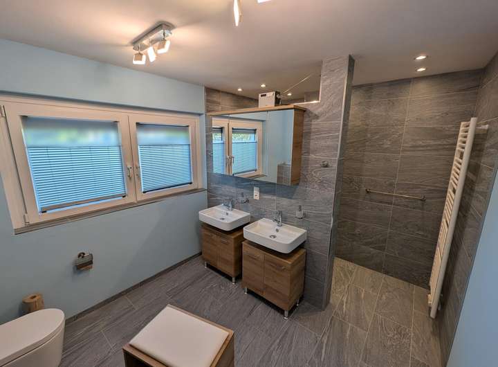 •Großes, barrierefreies Badezimmer mit bodentiefer (Regen-) Dusche, Doppelwaschbecken und Bidet Armatur.