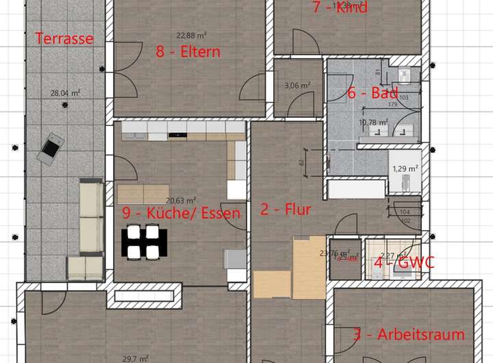 Terrasse, Garten, Keller, Duschbad, Einbauküche, Gäste-WC, Fliesen